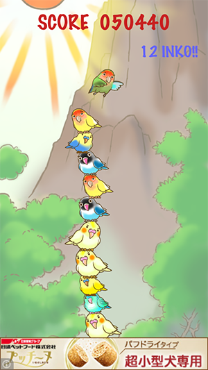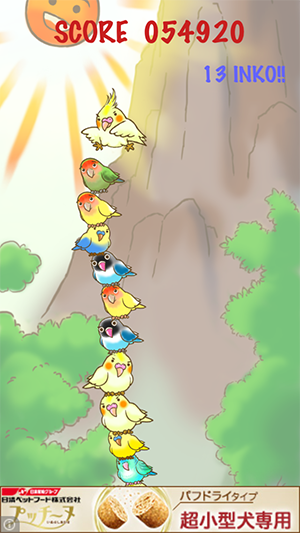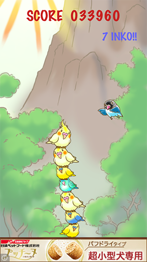 色とりどりの7種類のかわいいインコが次々と頭に止まっていくよ〜インコの積みゲーム。「つみインコ」無料♪