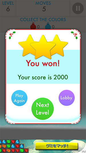 レベルごとにクリア条件が異なるよ。移動回数、制限時間、獲得点数などが条件になるよ〜