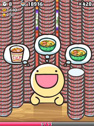 制限時間内にすばやく連打をして、食いしん坊なふしぎな生き物「ふにゃもらけ」にたくさんのラーメンを食べさせよう!
