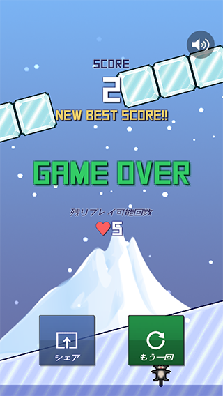 氷の斜面をタップで登りながら、降ってくる氷ブロックを避ける、激ムズ系シンプルアクションだよ〜