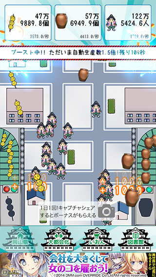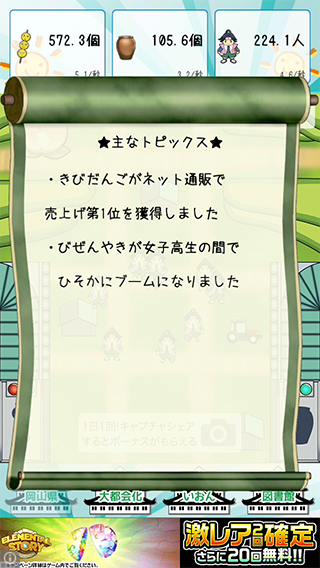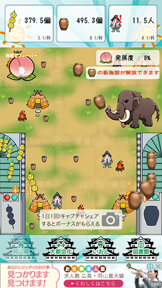 「きびだんご」と「びせんやき」をタップで生産。放置でも増えていくよ〜