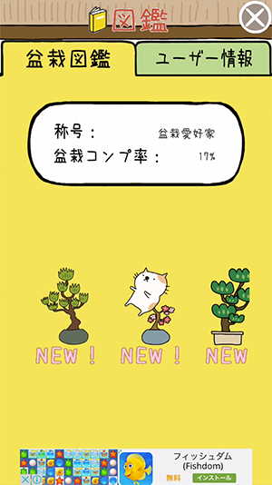 新種の盆栽を発見すると「図鑑」にコレクションされるよ。