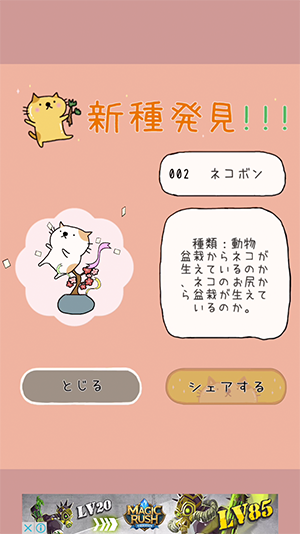 枝先にネコが生えてるっっ!?ちょっとシュールでかわいい盆栽の育成ゲーム。和んで癒されて、40種類以上の盆栽をコレクションできるよ「女子に人気ゲーム 『盆栽あつめ 』」無料♪