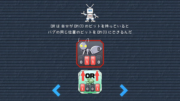 最初は、マスコットキャラの「ビットロボ」君がわかりやすく説明してくれるよ。