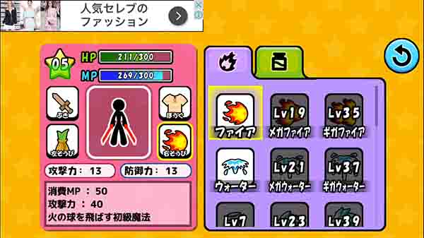 勝てない時は、クリア済みステージで、”経験値” と、敵を倒して落とした “コイン” を貯めるよ。