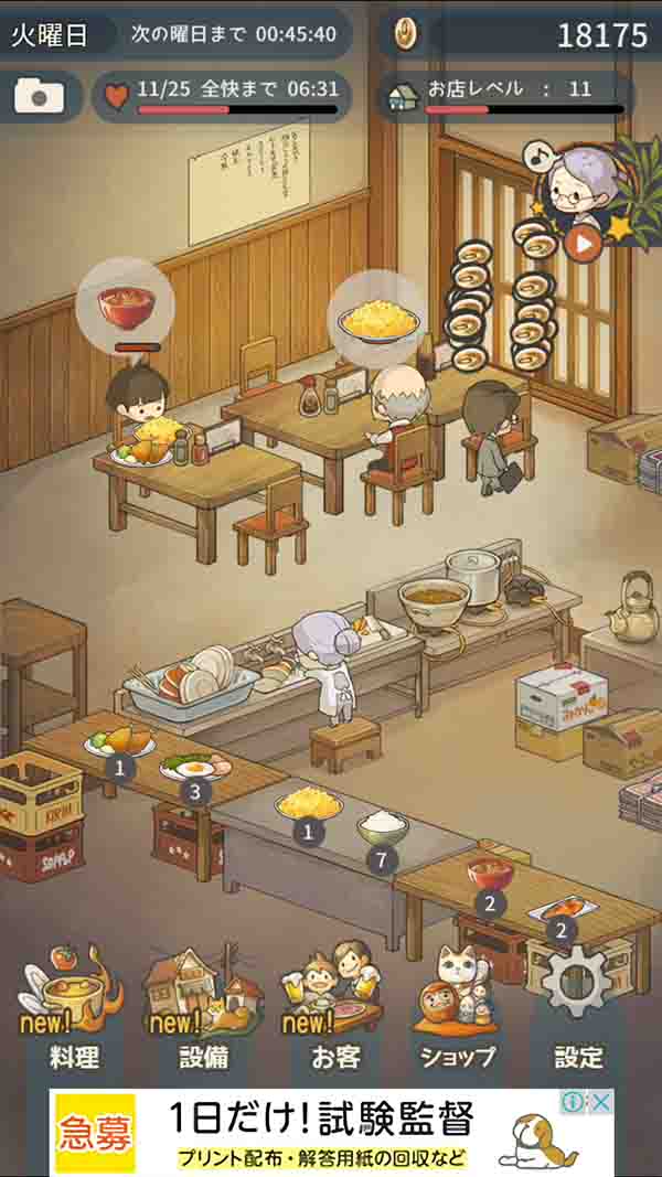 食堂に来た「お客さん」の出す “注文フキダシ” をタップ、食べ終わったら、”お金のフキダシ” をタップして、お代をもらうよ。