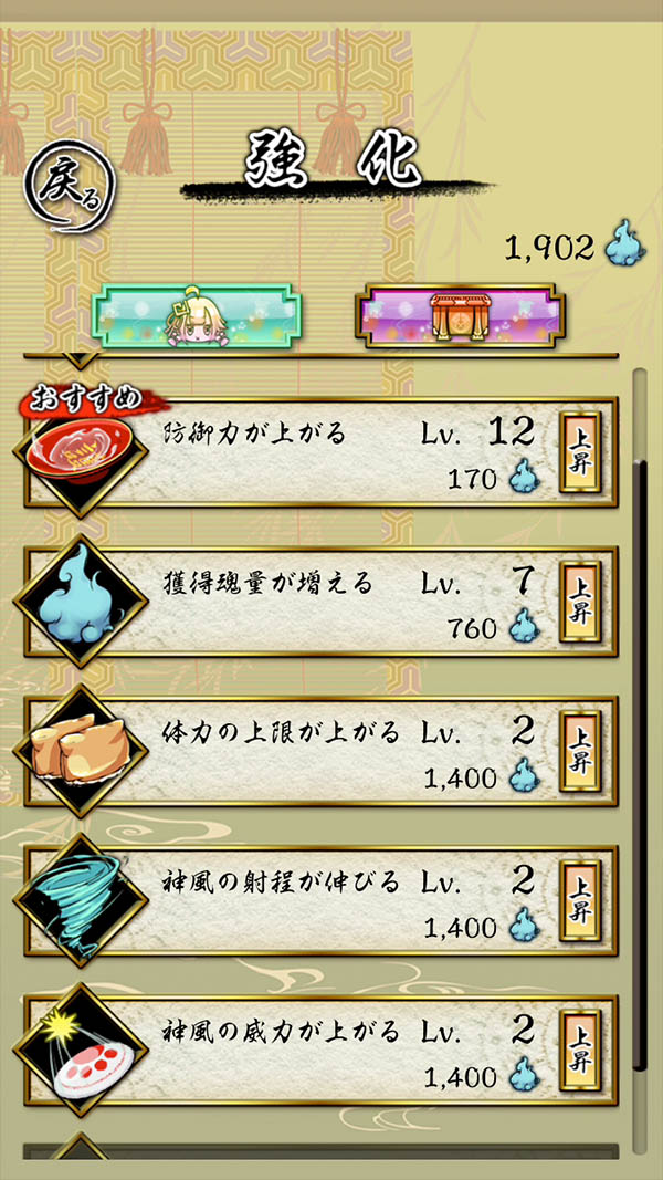ステージで浄化して手に入れた魂を消費して、能力の強化ができるよ。