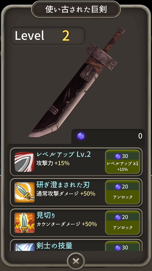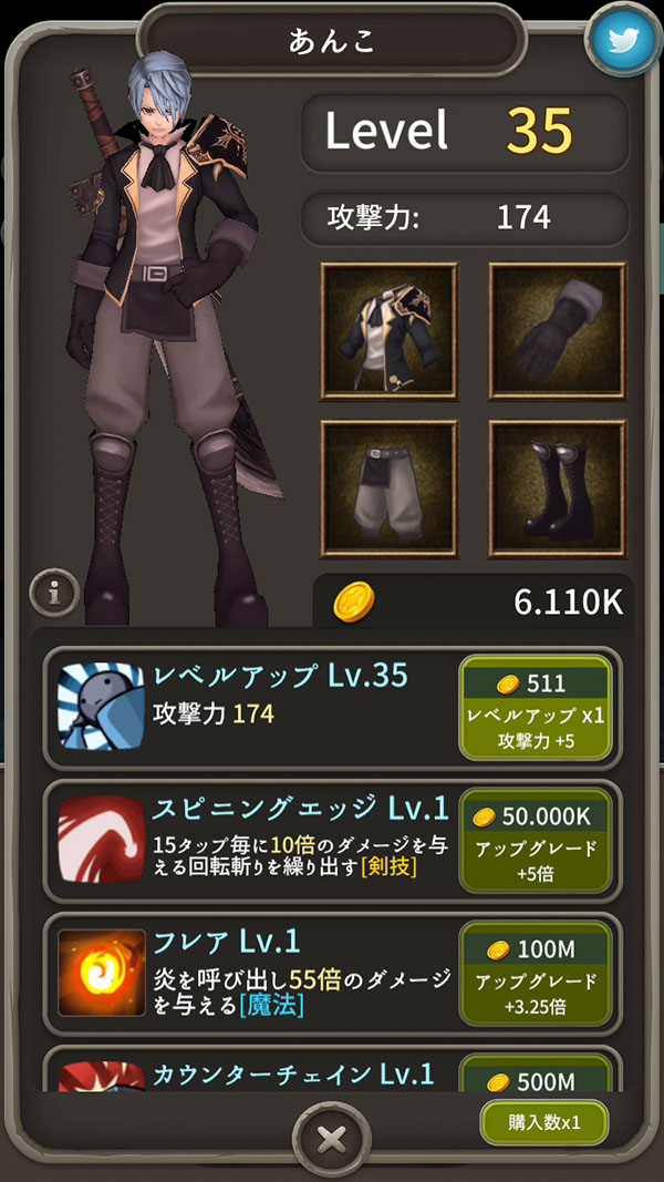 コインや宝石が貯まったら、”タブ” を開いて、プレイヤーキャラと武器の強化をしていくよ〜