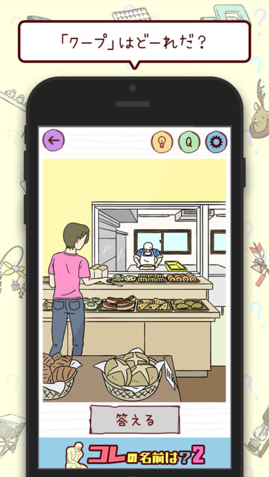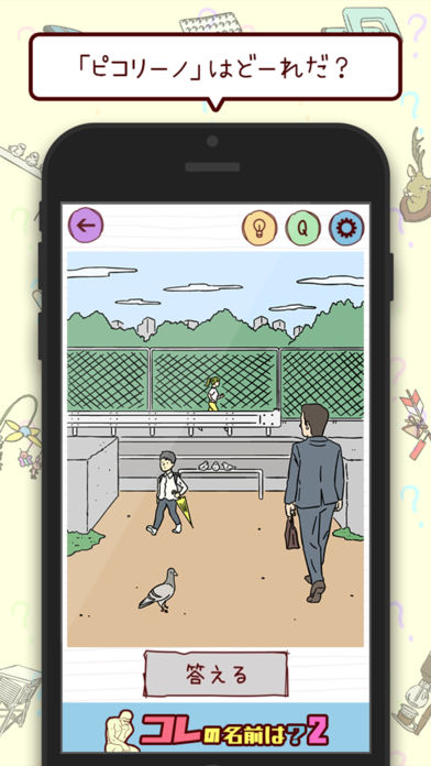 出題された「名前」のモノがどれか、イラストの中からタップして答えるよ。