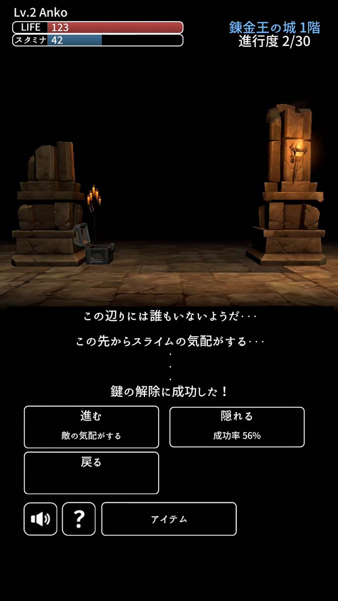 最初に主人公の名前を決めて、古城1階の探索が始まったけど、このダークな雰囲気と、ダンジョンを選択方式で進むところ、あんこちゃんが好きそうだね〜