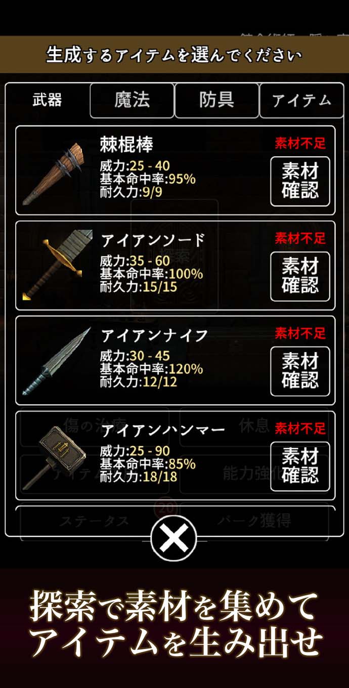 武器や魔法、回復薬などのアイテムを作らないと、すぐに死んじゃうよ〜