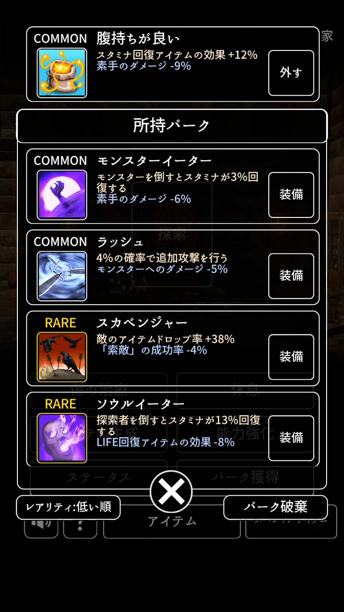 あと、装備やアイテムの他に「パーク」という特殊能力もあって、ダンジョンで手に入れたチケットを消費してガチャで手に入れるよ。