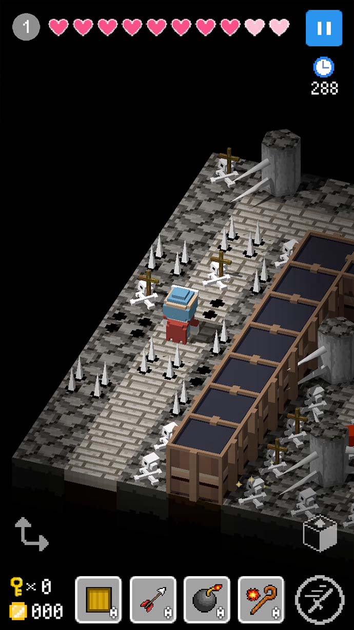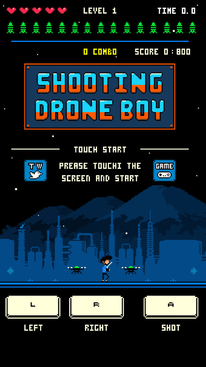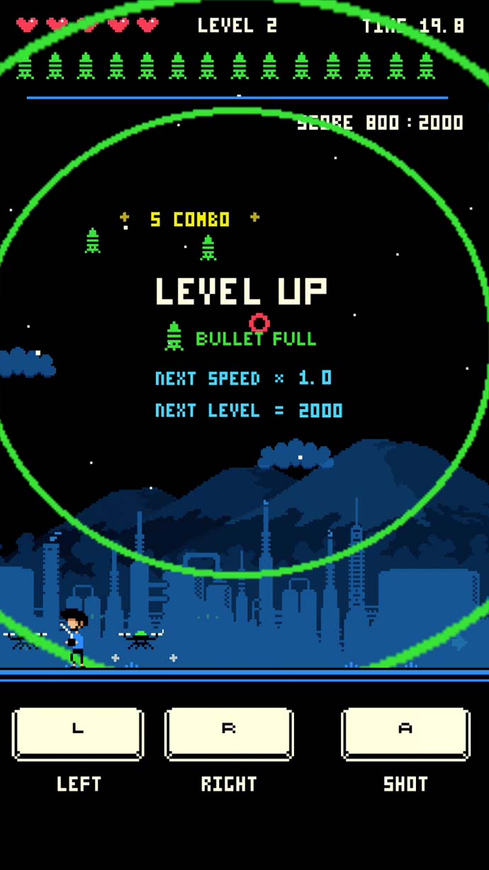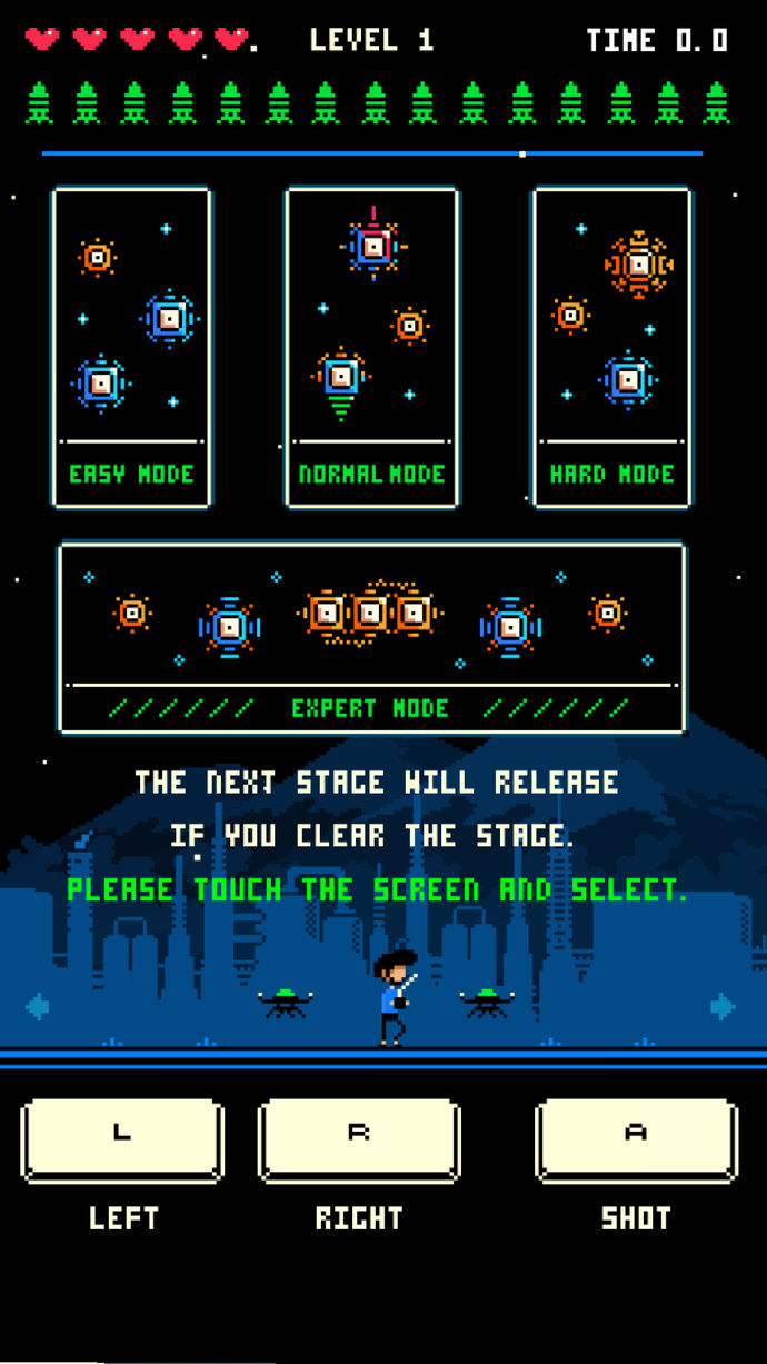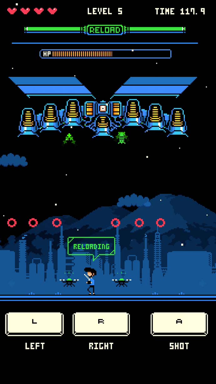 敵や敵の弾に当たるだけでなく、敵が地上に到達してもダメージを受けて、ハートが減るよ〜