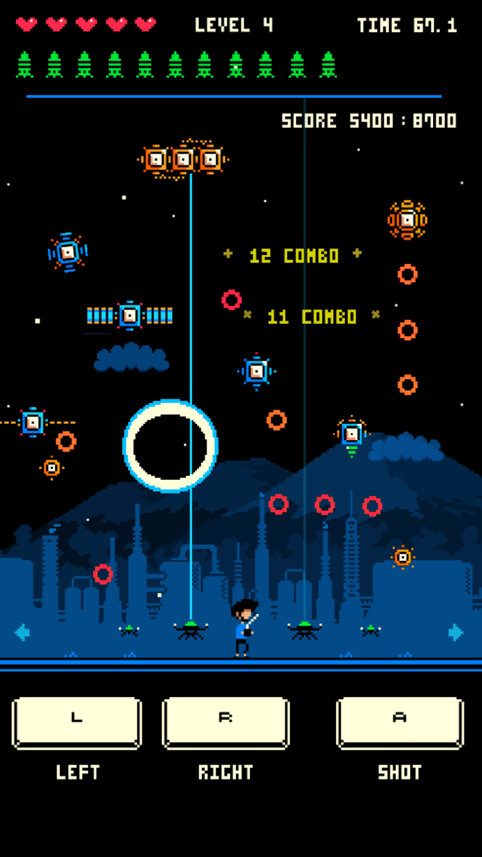 地上の人を左右に移動させて、攻撃を避けながら敵を倒すよ。