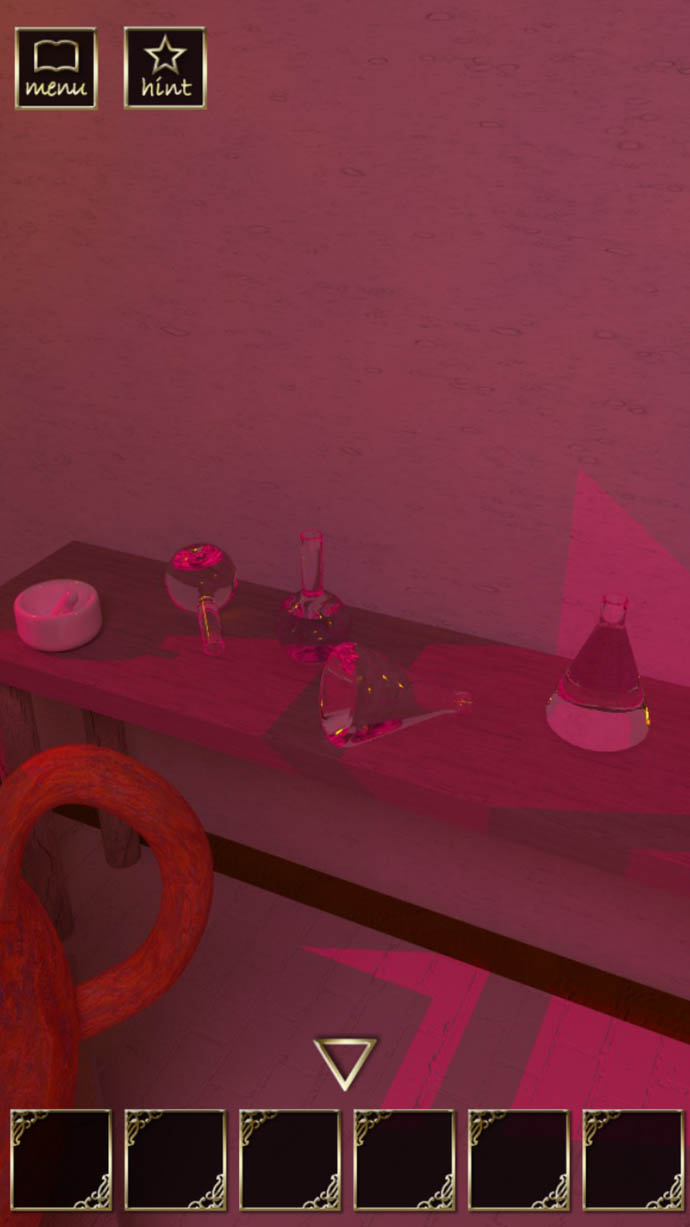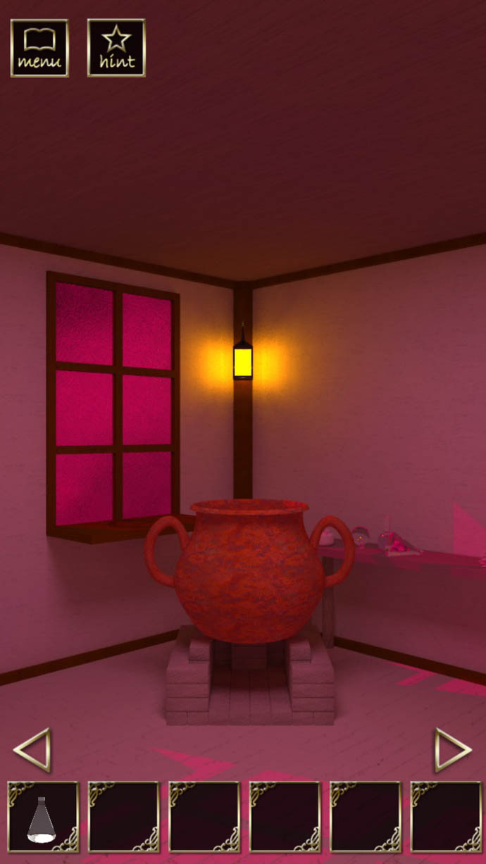 赤紫色に染まった怪しそうな部屋には、ホウキとか、液体の入った大きな壺などがあるよ。