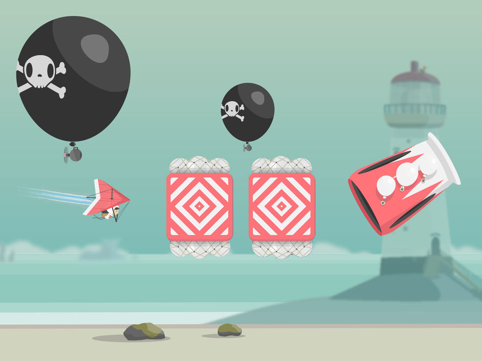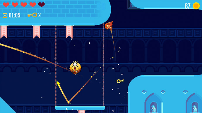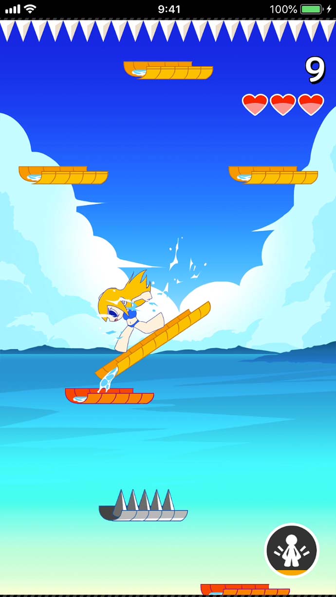 “HPゲージ” が0になるか、奈落へ落ちるか、制限時間のカウントが0になると死亡で、命を3回失ったらゲームオーバーになるよ〜
