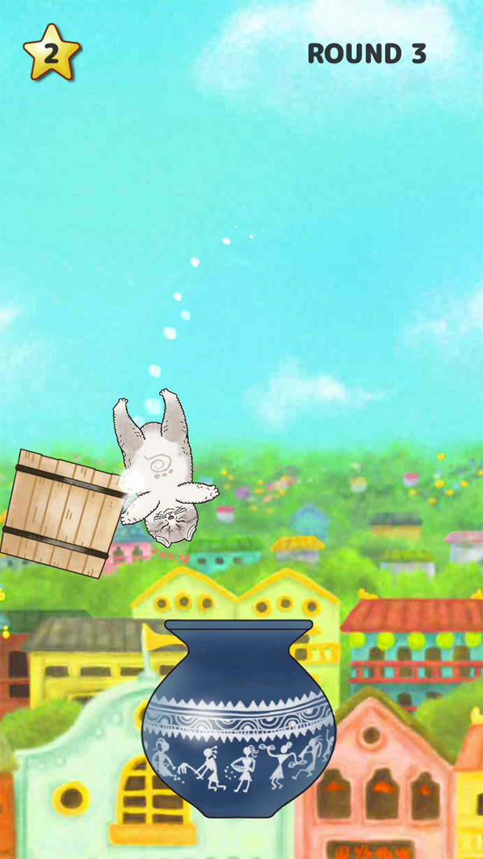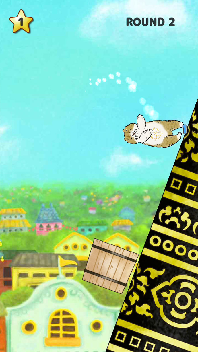 空中で動いている「猫神様」が、壺や樽などに入るように、タイミング良くタップして落下させるよ〜