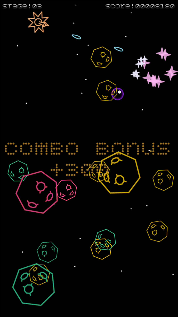隕石を全て消すとステージクリアで、次のステージに進めるよ〜