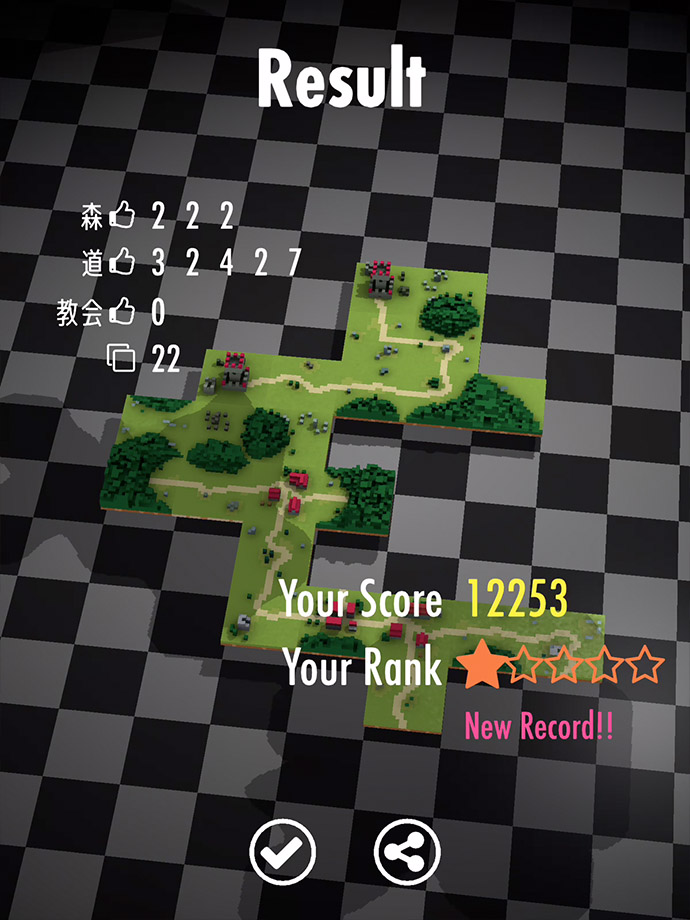 森や道などの項目別得点と、セットできたパネルの数が表示されるね。