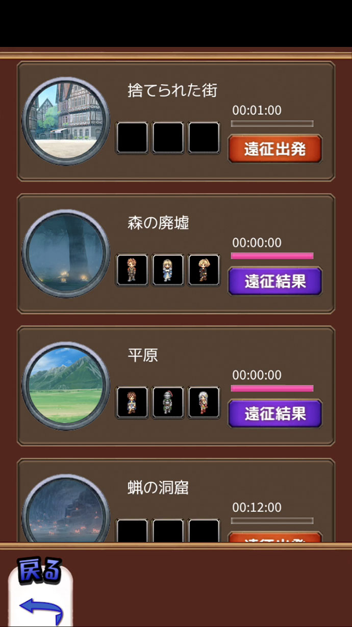 ダンジョン攻略させるのとは別に、アプリを落としている間でも地上の各地へ「遠征」に出せるのも嬉しいね!