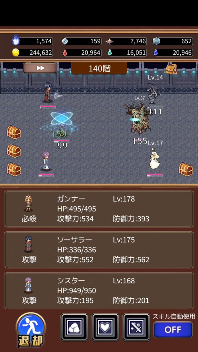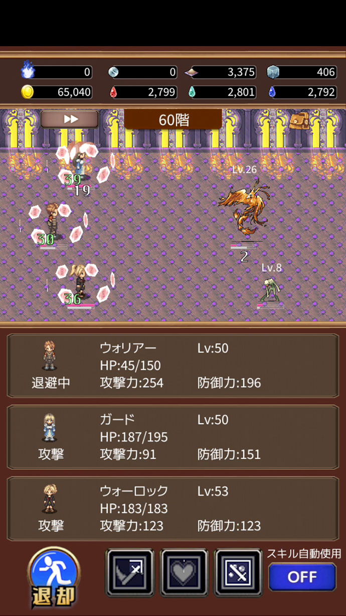 戦闘はオートで、早送りで進むこともできるよ〜