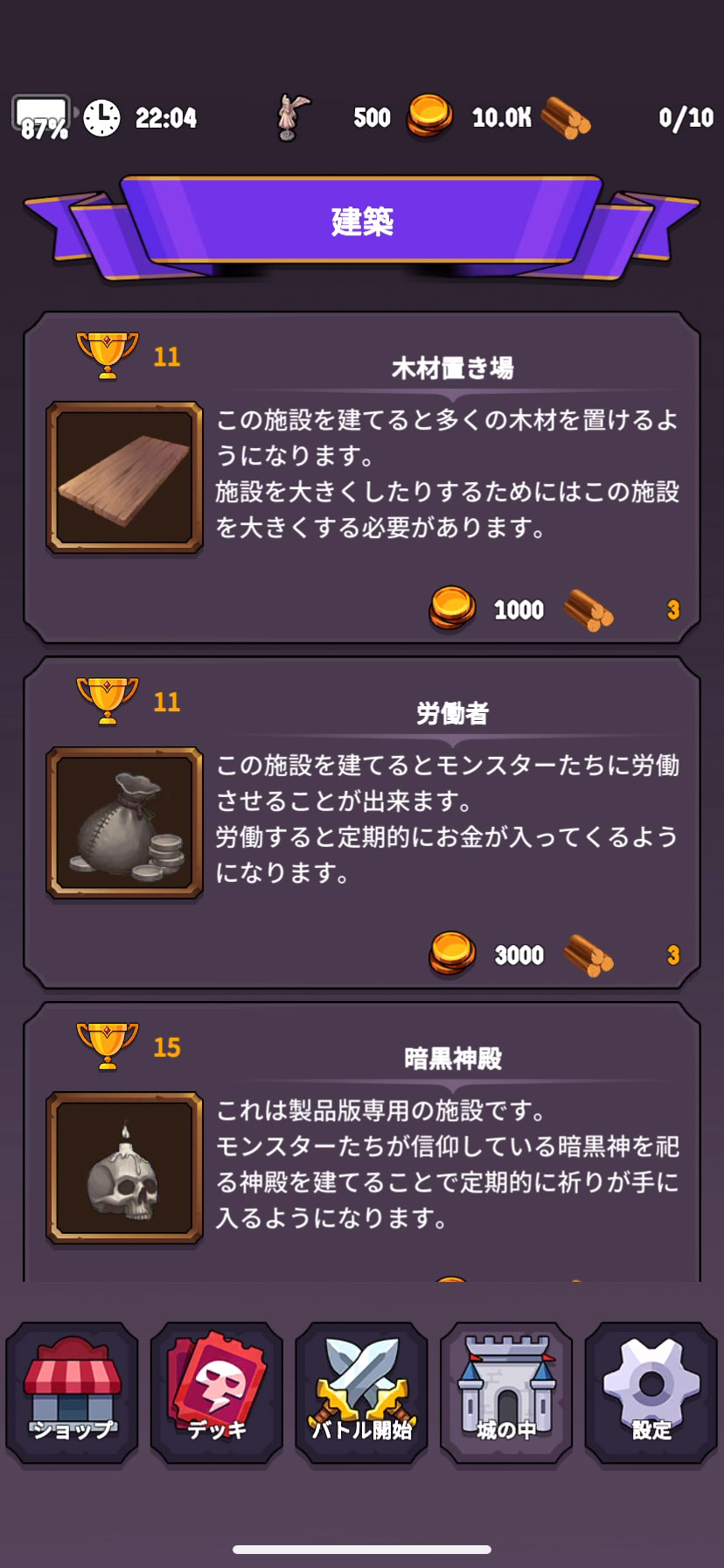 報酬はコインの他に木材もあって、これらを消費していろんな施設を建設できるよ〜