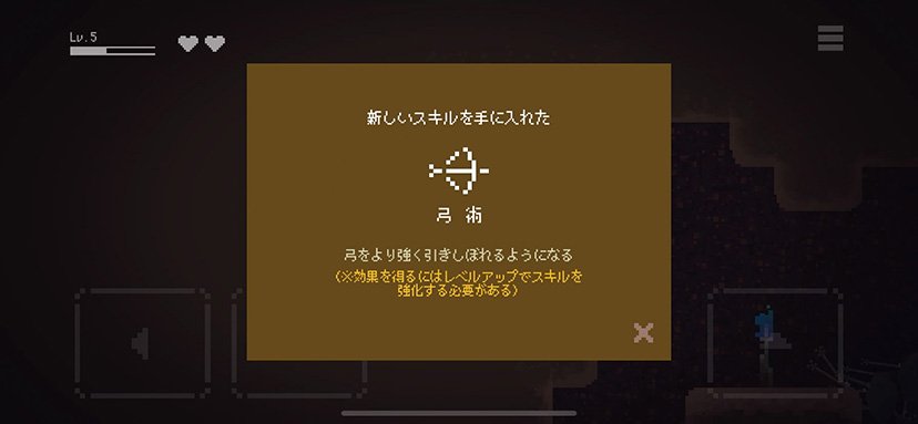 レベルアップ時に[命が増える][足が速くなる][弓を射る力が強くなる]などの9種類のスキルを強化することができるよ。