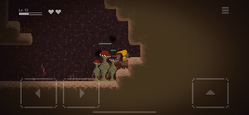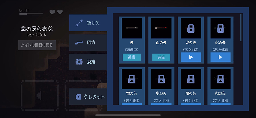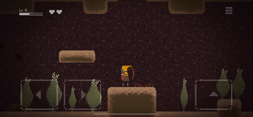 謎の洞窟の中、弓矢だけでモンスターを倒すよ!洞窟の奥には何がある?射るのが楽しい!ドット絵横スクロールアクションゲーム「弓矢で洞窟探索アクション – 命のほらあな」無料♪