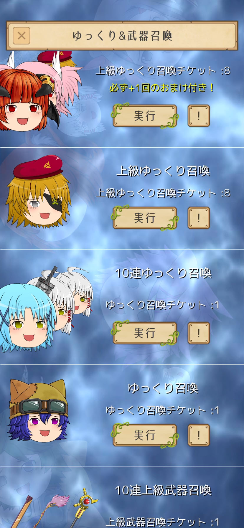 召喚=つまりガチャで、ゆっくりまたは武器が手に入るよ。