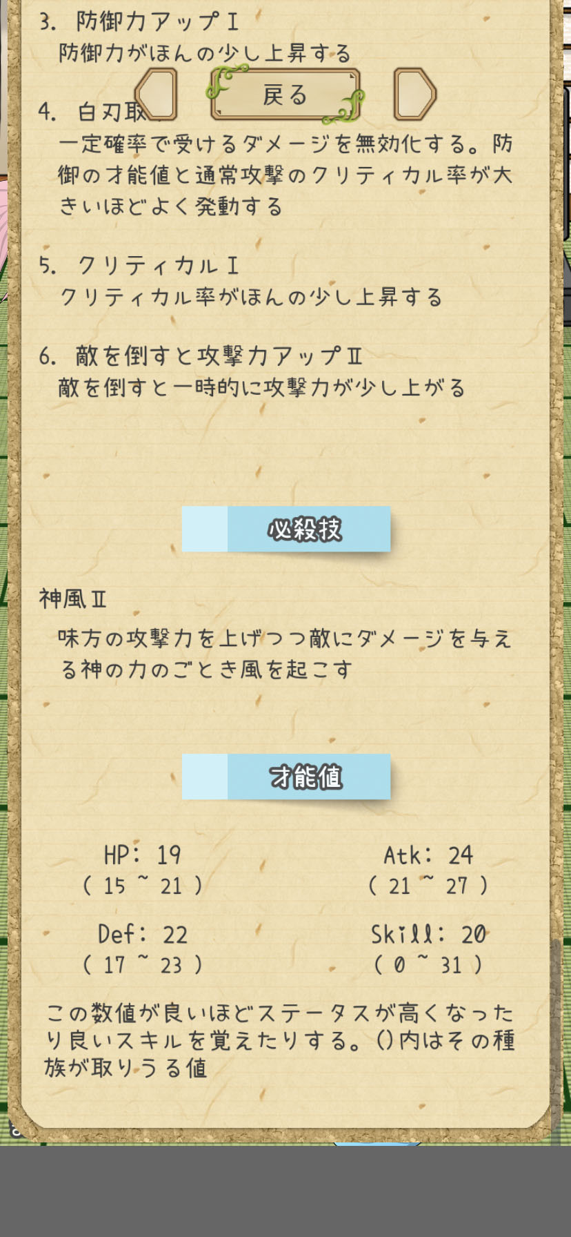 個人のステータス画面に”才能値”があって、この数値が良いほどステータスが高くなったり良いスキルを覚えたりするそうだよ〜