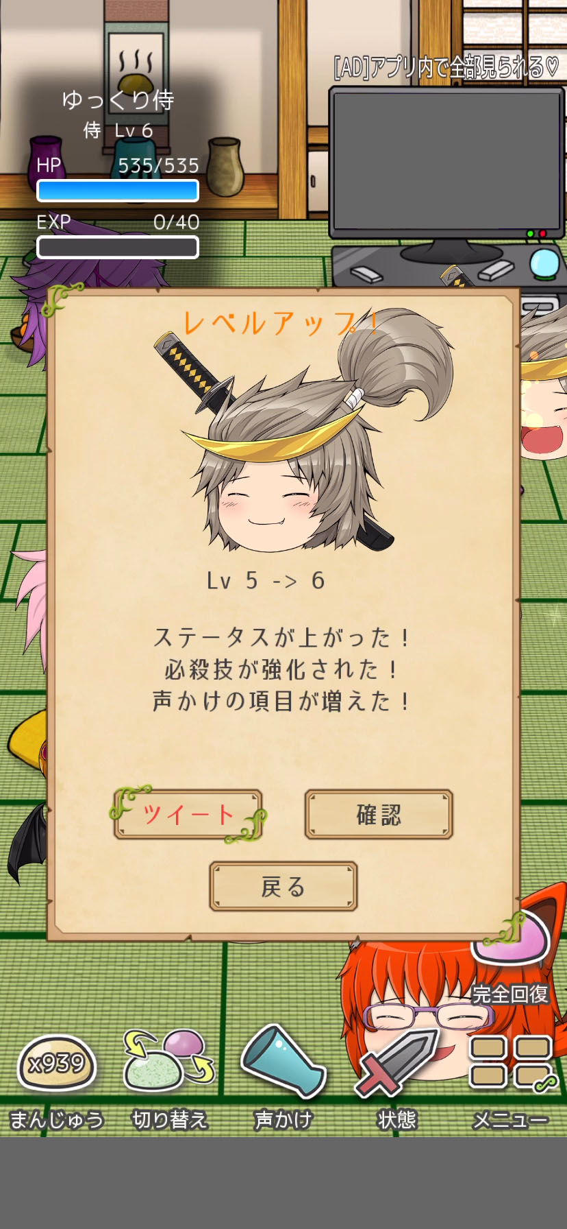 報酬のまんじゅうを食べさせるとゆっくりがレベルアップするよ〜!