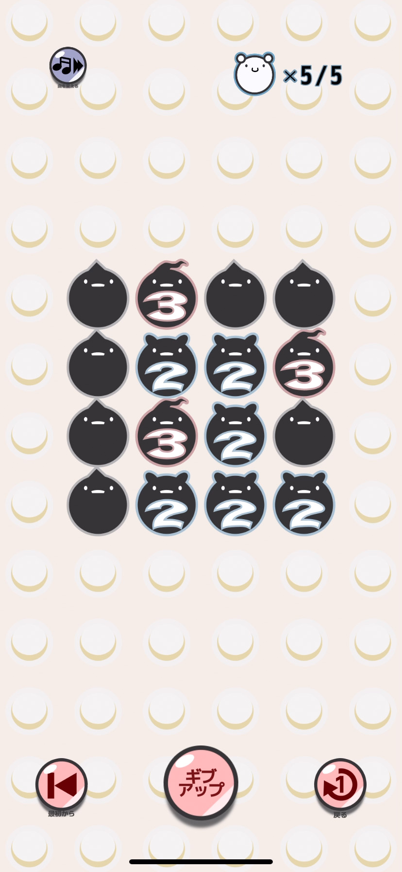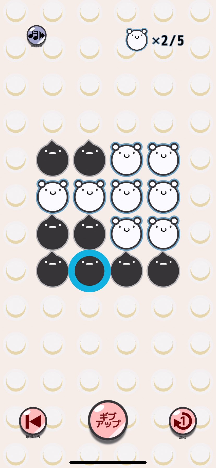 各ステージごとに手数が決まっいて、どれか1つの黒い悪玉をタップすると、タップした悪玉と縦横斜め方向につながった悪玉が白い善玉に変わるよ〜