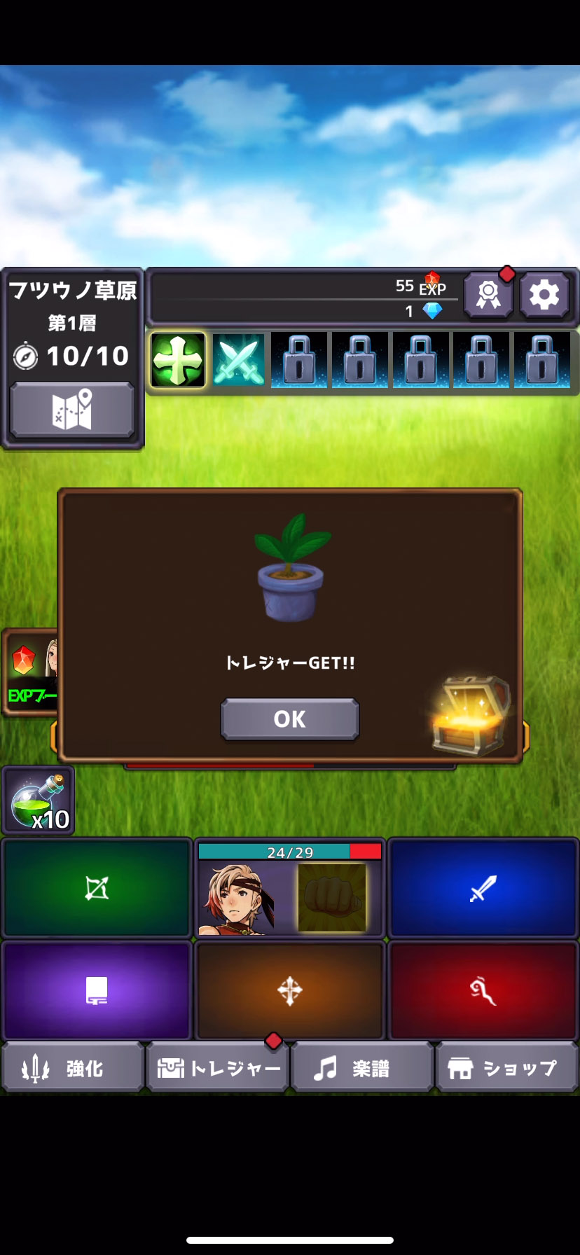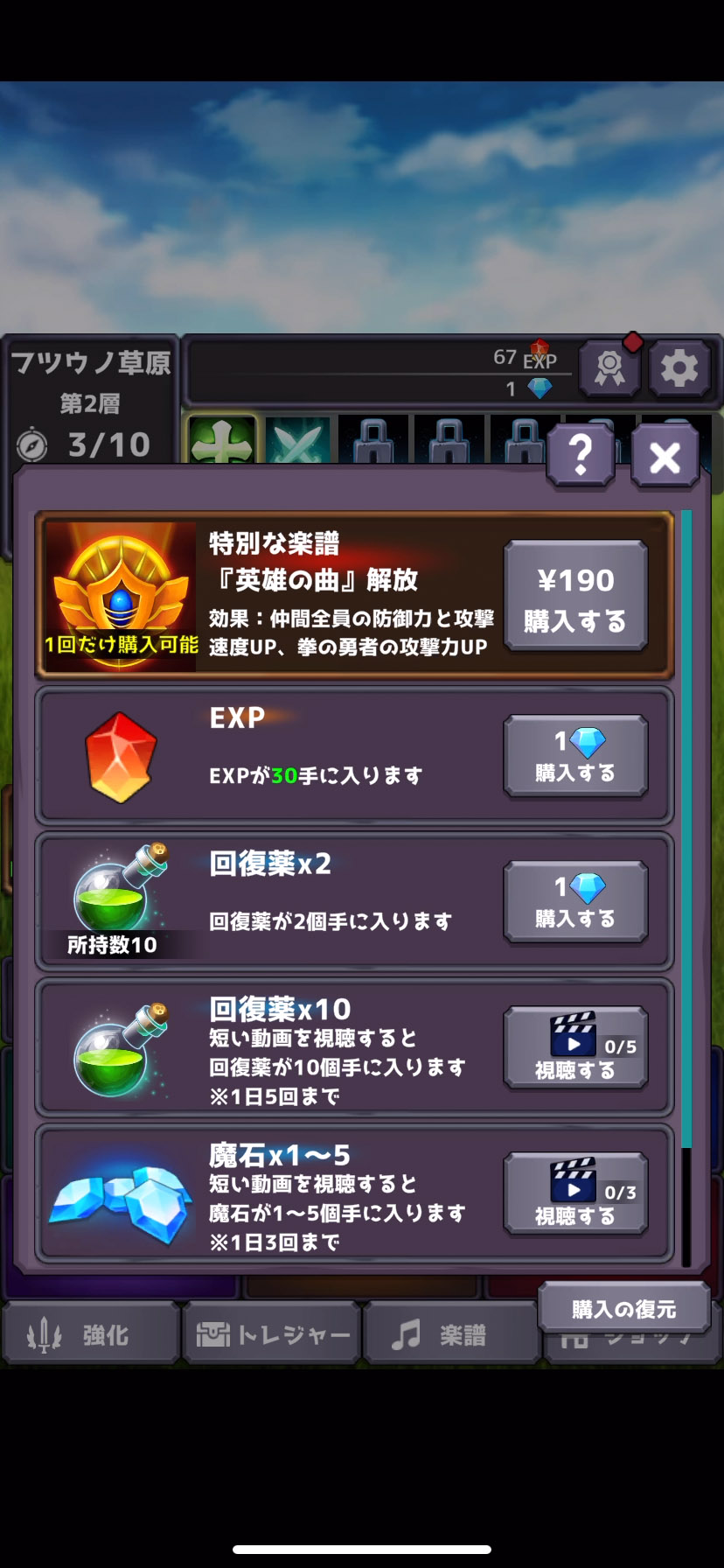 ホーム画面はなくて、勇者の[強化]や、[ショップ]でのアイテム購入などは、各ボタンからウィンドウを開いて行うよ。