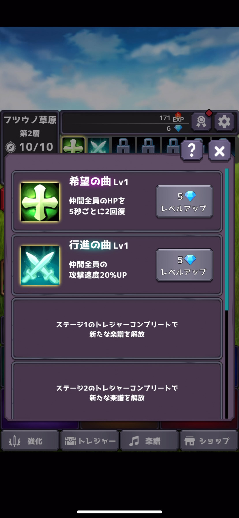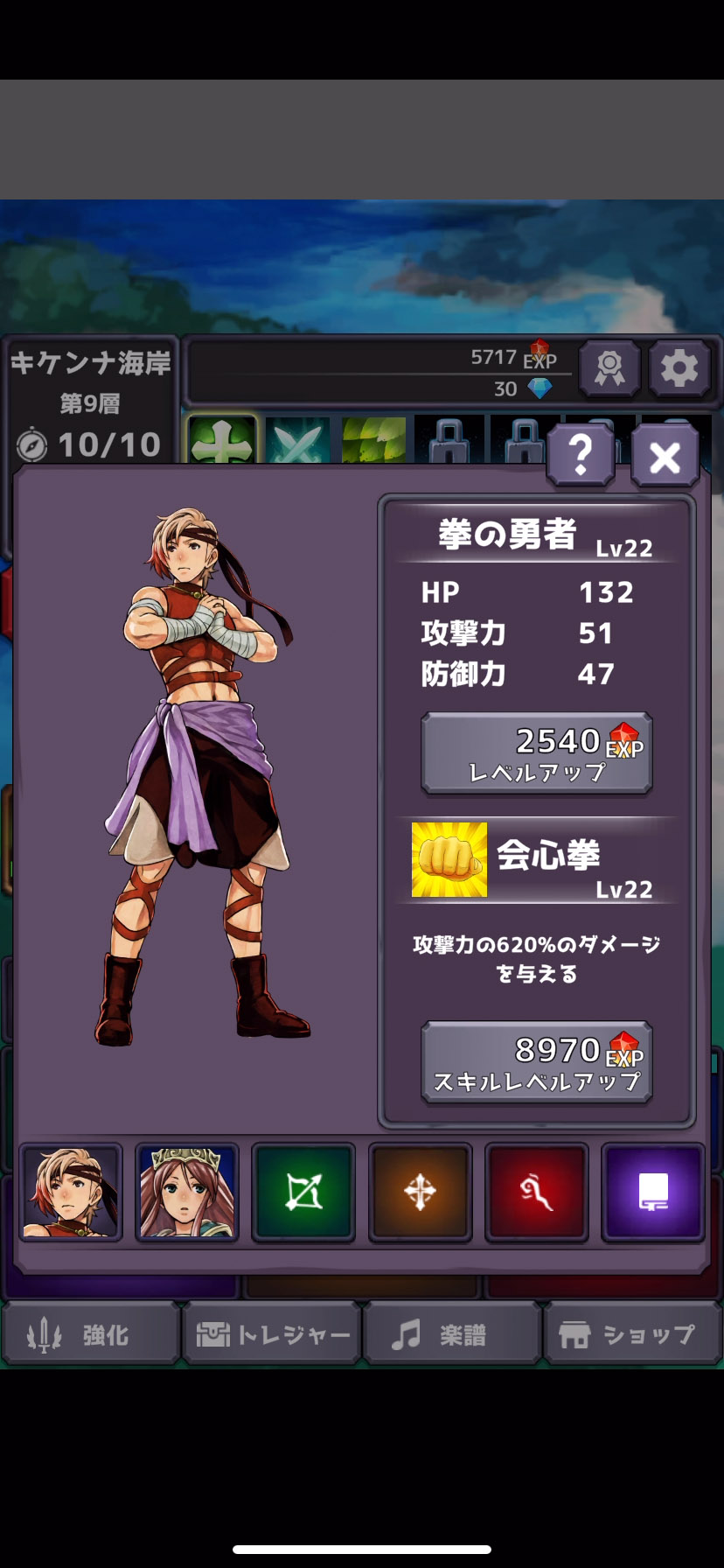 ステージが進むと敵も全体攻撃するようになって、手強くなるけど、クリアしたステージに戻って放置で経験値を稼ぐこともできるんだね。