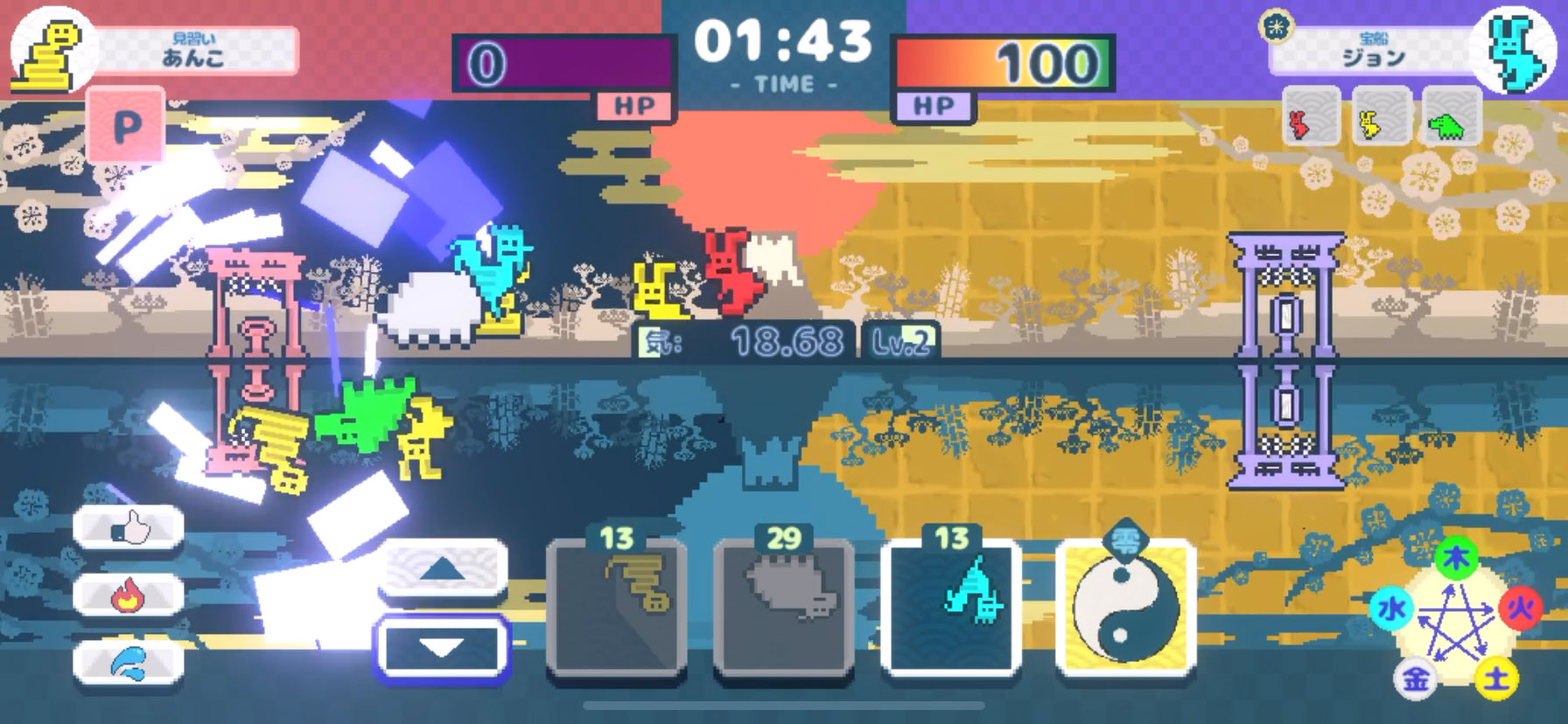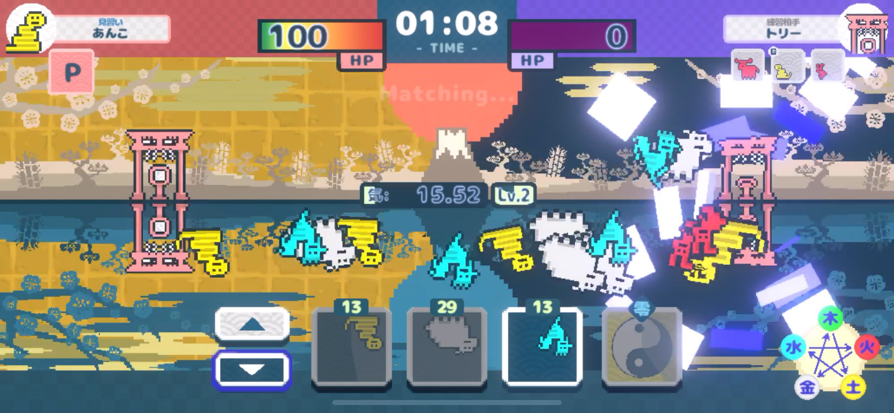 自分のタワー(鳥居)を守りつつ、敵のタワーを攻めに行くよ〜