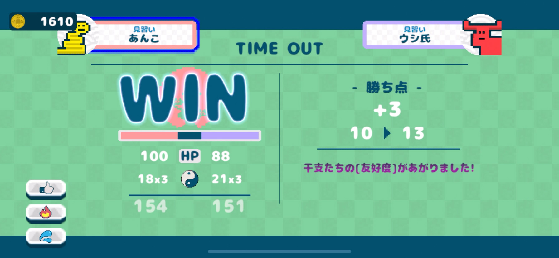 バトルで使った干支は友好度が上がって、強化できるようになるよ〜!