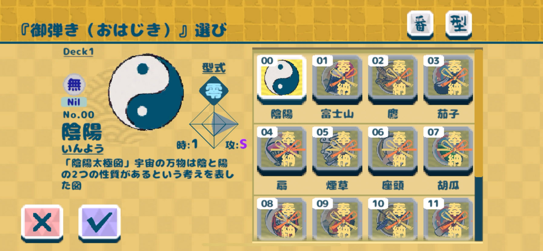 相手の干支を一掃できるほど攻撃力の強い「おはじき」は待機時間が長くなるよ。