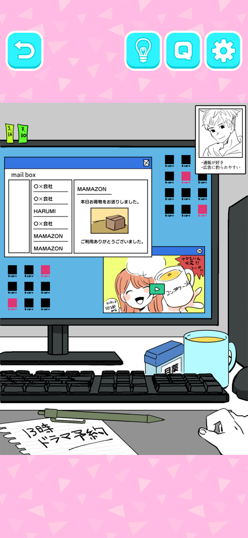 彼氏が隠したウワキの証拠を見つける、楽しい謎解き・浮気推理ゲーム。