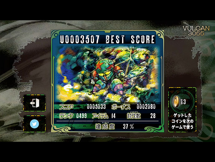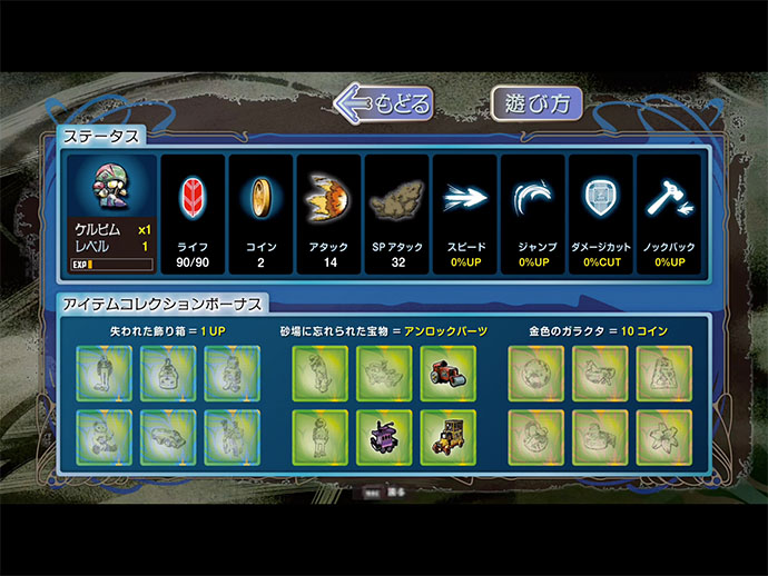 ダメージカット、チャージ強化、ノックバック強化アイテムは、ゲットするとゲームオーバーまで効果が続くよ。