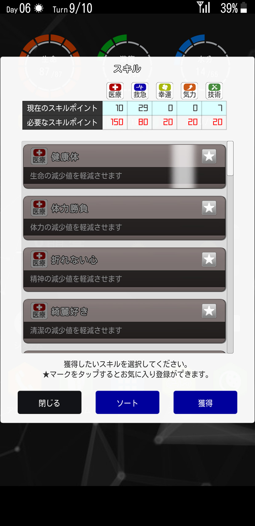 体調のパラメーターを参考に行動を選ぶと、ターンが終了して時間が経過するよ〜