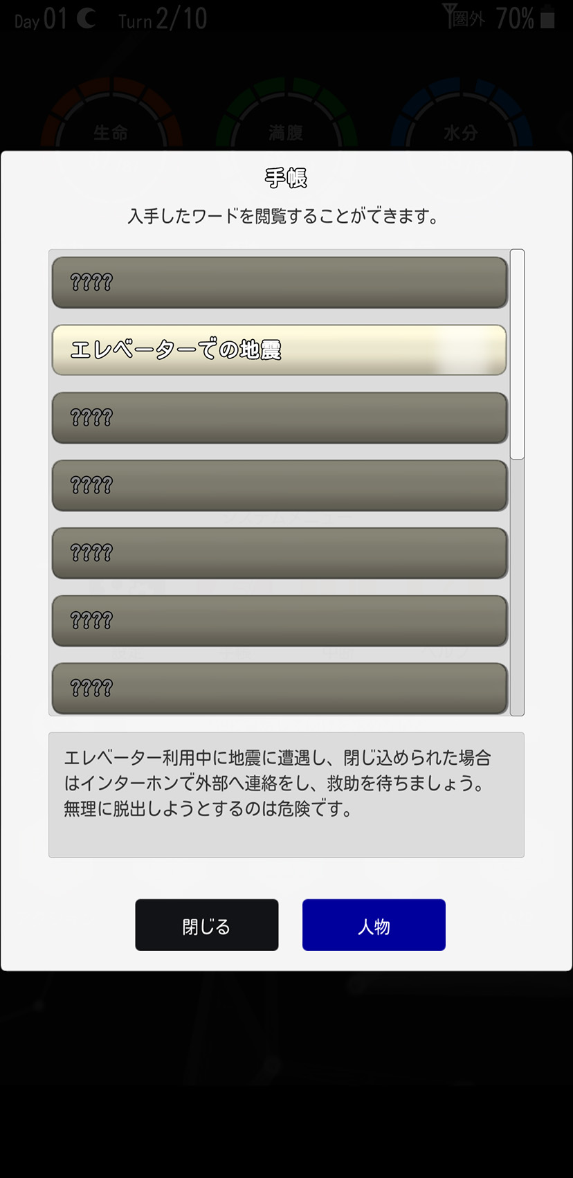 巨大地震によって閉じ込められたエレベーターの中でサバイバルする、災害体験アドベンチャーゲーム。