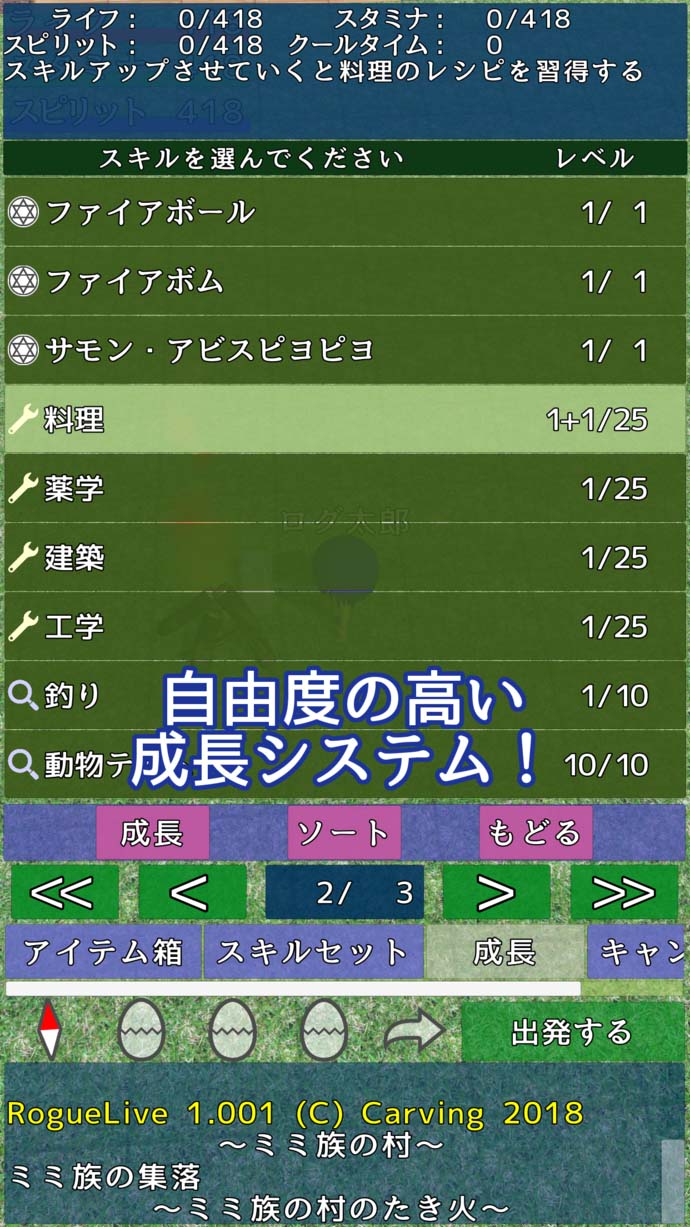 レベルアップ時に[命が増える][足が速くなる][弓を射る力が強くなる]などの9種類のスキルを強化することができるよ。