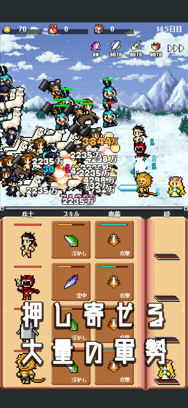 メジェド様やアーティファクトのレベルアップや進化などでメジェ教団を育成すると、もっと派手で爽快に敵を倒せるようになるよ。