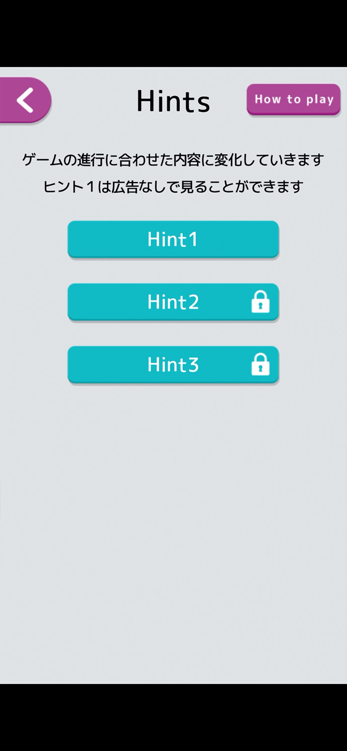「ヒント」機能は段階で分かれていて、ヒント1は広告無しなので、すぐに見ることが出来るよ。