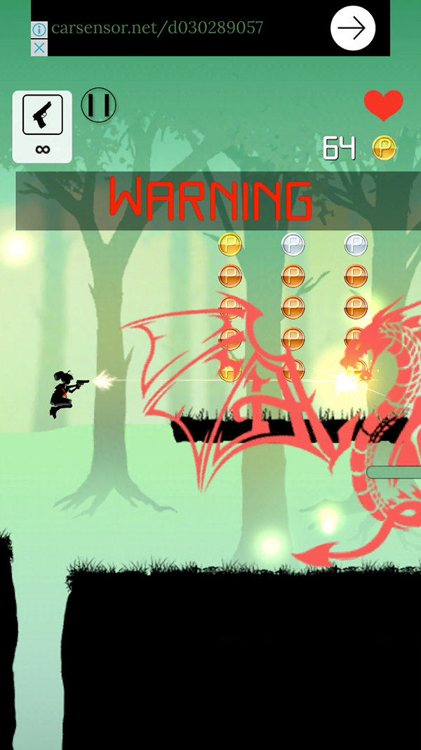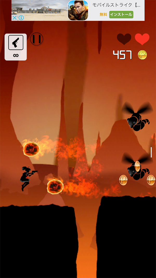 右画面タップでジャンプ、そのまま空中でタップすると2段ジャンプになるよ。
