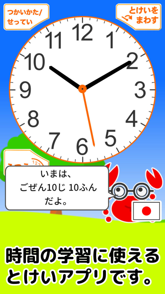 時計の針を回して、カニさんをタップすると、時刻をしゃべってくれるよ。